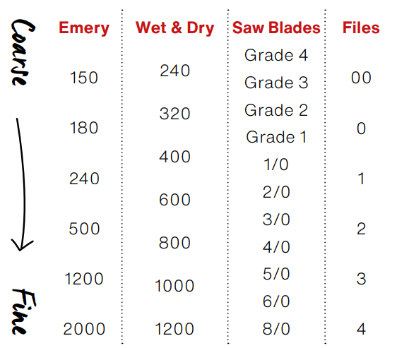 For best results, work through grade by grade, though you can skip one or two. It can also be used on wooden sticks, similar to using a file, or on a flat even surface. After going through the grades, the metal is ready for final finish, e.g. polishing.